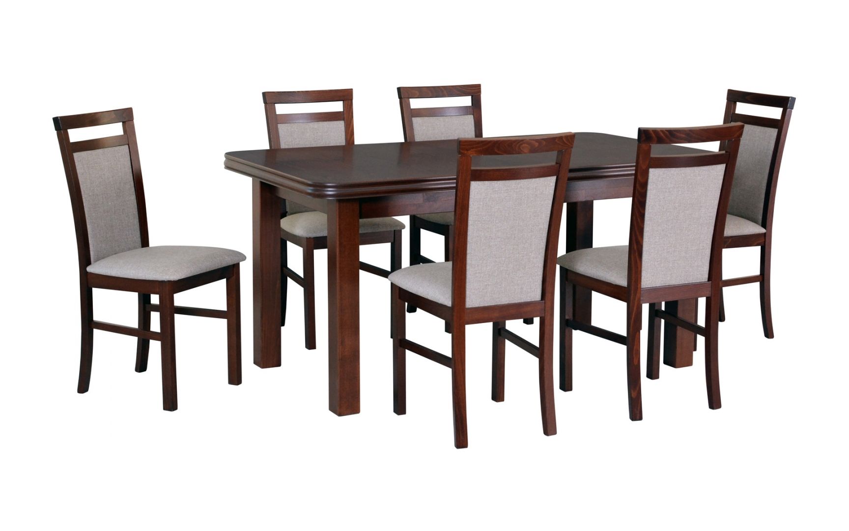 Elegantní jídelní sestava vhodná pro stolování 6 lidí. Jídelní židle z bukového masivu jsou polstrované, samozřejmostí je výběr barvy a struktury potahu. Konstrukce stolu je vyrobena z výběrového bukového masivu a deska stolu je z odolného praktického lamina s ABS hranou. Vysoká kvalita a klasický design jídelních židlí a stolu zaručuje dlouhou životnost.